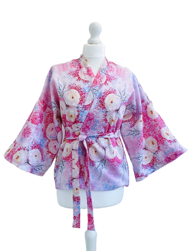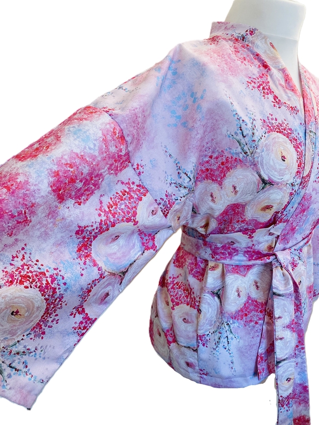 Optez pour un look chic et artistique avec notre blouse kimono nouée à la taille, confectionnée en satin de coton et imprimée de motifs floraux inspirés de peintures impressionnistes. Cette pièce raffinée se porte aisément sur un jean, un pantalon large et fluide, ou une jupe pour un style unique et sophistiqué.