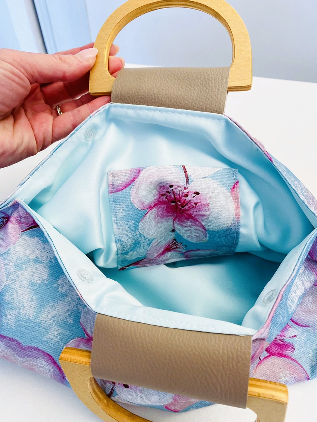 - Matériau et Design : Imprimé avec de mes motifs originaux, ce sac apporte une touche artistique et sophistiquée. Les anses en bois offrent une prise confortable et un contraste élégant avec les couleurs florales.